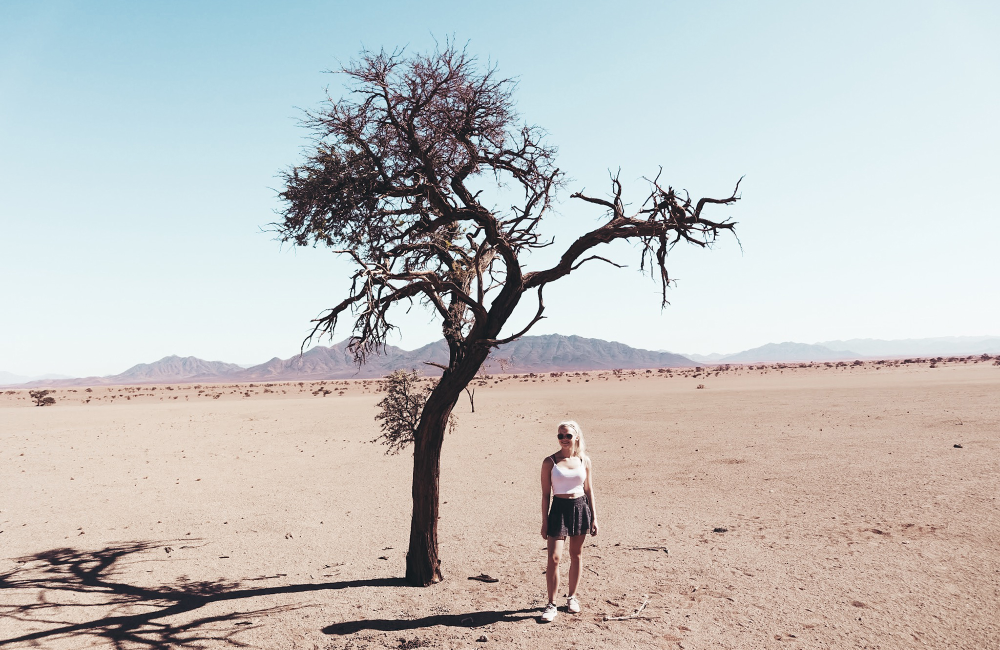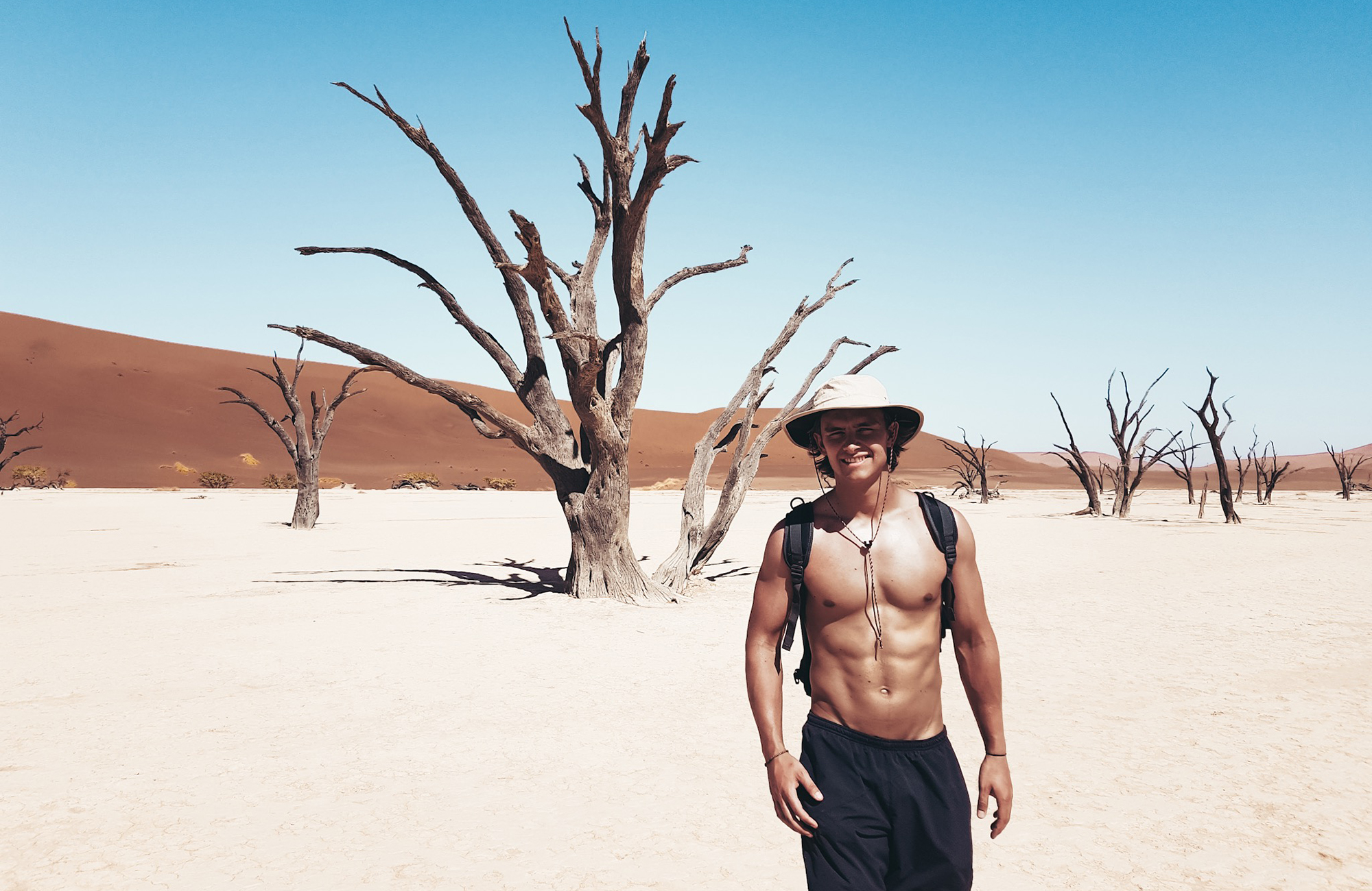 Eftir að hafa hlaupið niður stærsta sandfjall í heimi þá enduðum við í Deadvlei sem er eldgamalt svæði og á því svæði eru tré sem þornuðu upp og dóu fyrir um sirka 600 árum.