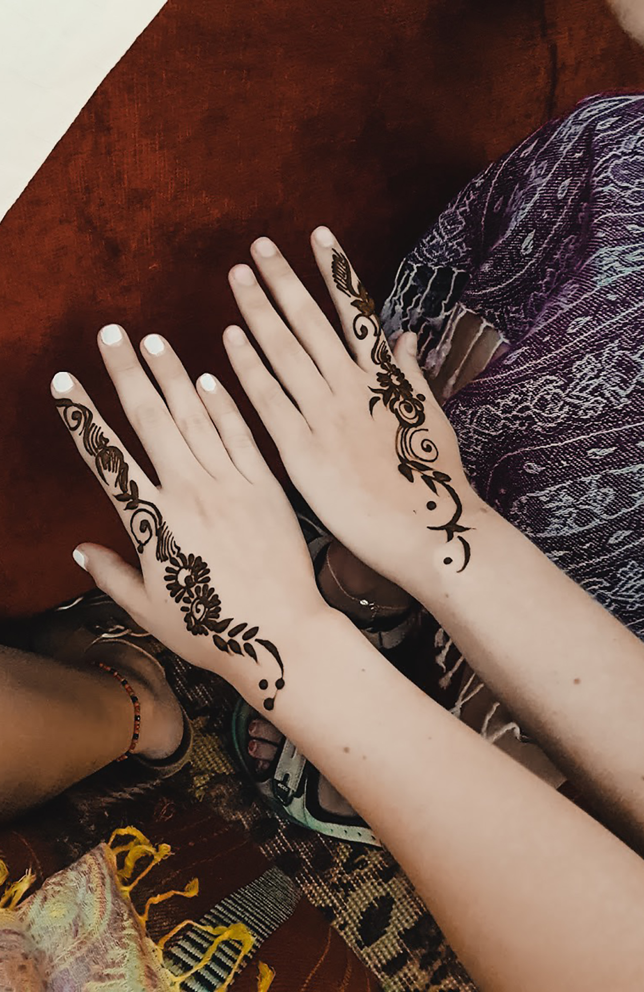 Eftir keyrsluna hittust allir saman í eyðimörkinni til að borða og horfa á skemmtiatriði. Við fengum okkur öll líka henna tattoo.